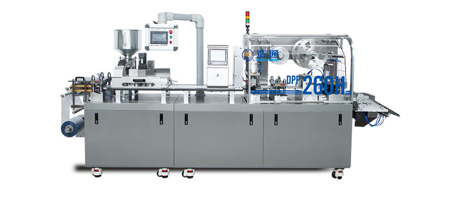 DPP-260H平板式泡罩包装机集光、机、电、气一体,由PLC可编程序控制,伺服牵引、摄像检测、图文对版、安全外罩,能自动完成成形、加料、热封、压痕、冲裁等工序,适用于制药、食品、电子、医疗器械、五金制品等行业的铝塑、纸铝、铝铝包装。